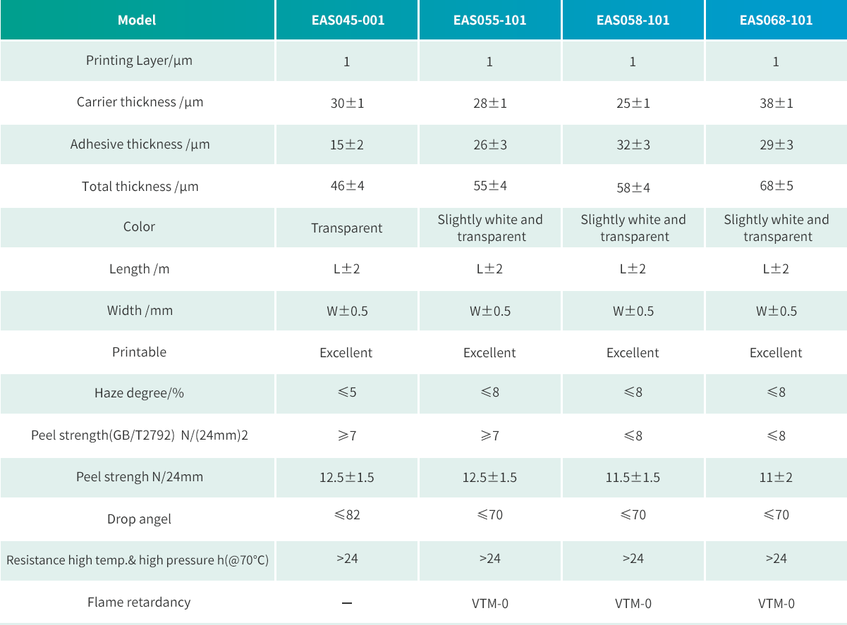 Excellent printability.Stable peeling strength.High cohesion of the adhesive layer.